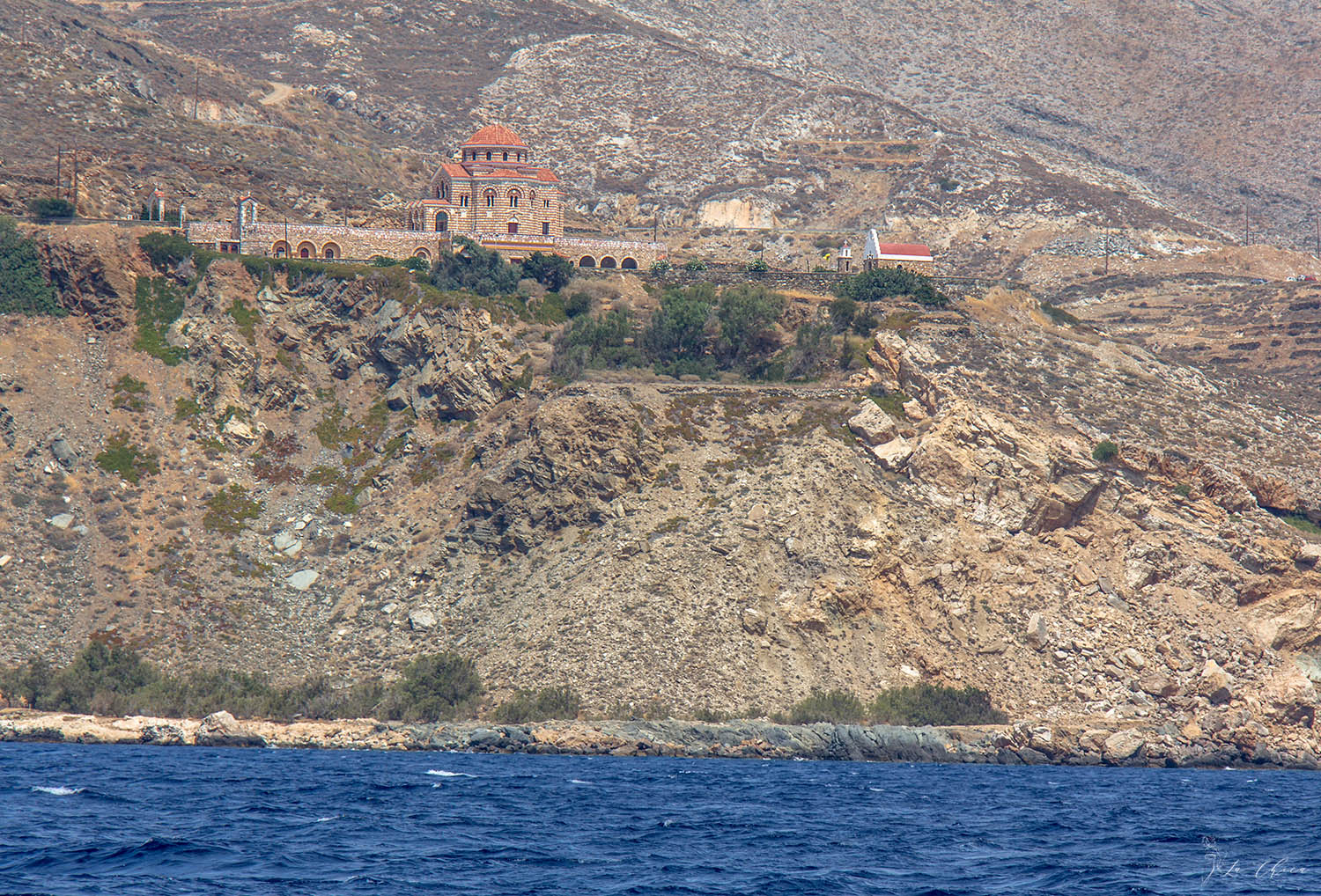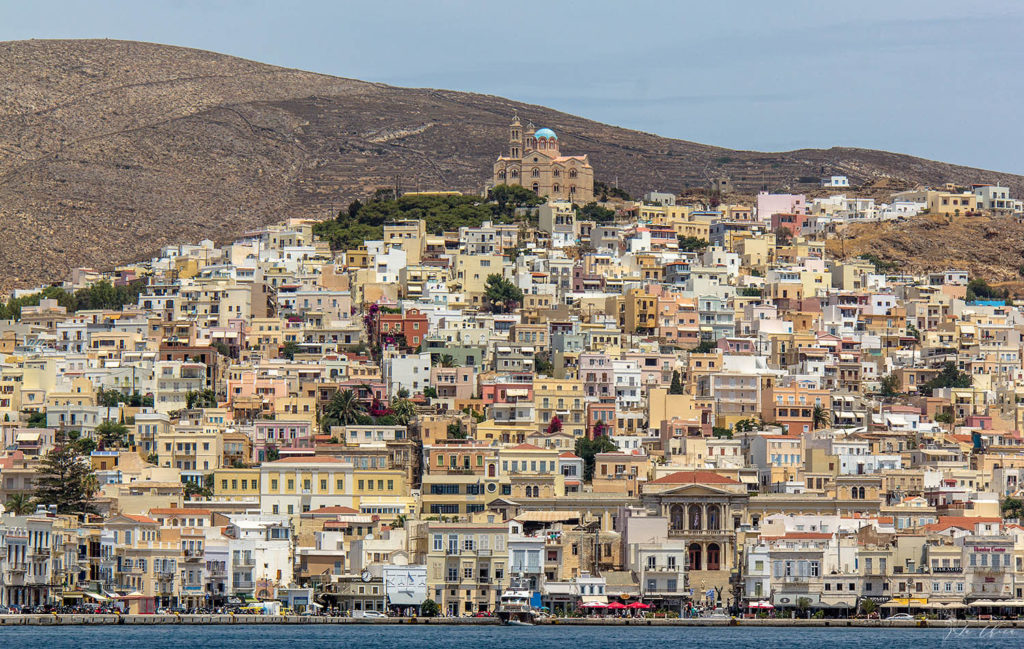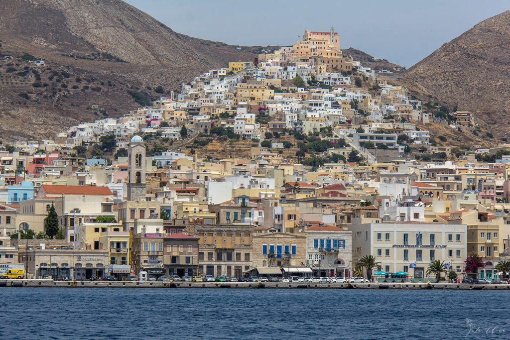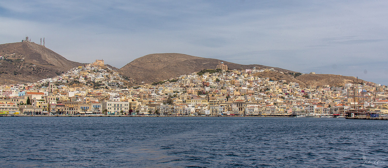С Миконоса пошли на Сирос. Не длинный переход, хорошая погода и подходящий ветер, всю дорогу шли под парусом, даже гадали, успела ли нагреться вода для душа за то время пока выходили из марины под мотором. Сначала зашли в бухту возле их главного города Эрмуполиса. Городок очень приятный на вид. Жилой и живой в отличие от искусственного Миконоса. Красиво смотрятся домики сползающие с двух холмов. Но сама бухта для стоянки не очень. Продувается ветрами, марины нет, на якорь не встанешь. Яхты стоят попой к набережной, но носового муринга нет, надо бросать якорь и на него растягиваться. И стоять при этом будешь близко близко к кафешкам, и все сидящие там будут разглядывать где и что у тебя лежит. Мне так не нравится.