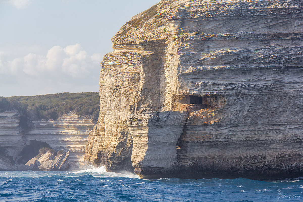 На подходе издали полюбовались верхним городом, обрывающимся прямо в море. Жаль что поближе подойти нам уже не позволило время. Прошли мимо маяка и под фортом на утесе над входом. И везде по сторонам, если внимательно приглядеться, можно заметить еще и дополнительные доты, построенные (хотя скорее уж прогрызенные) в скалах.