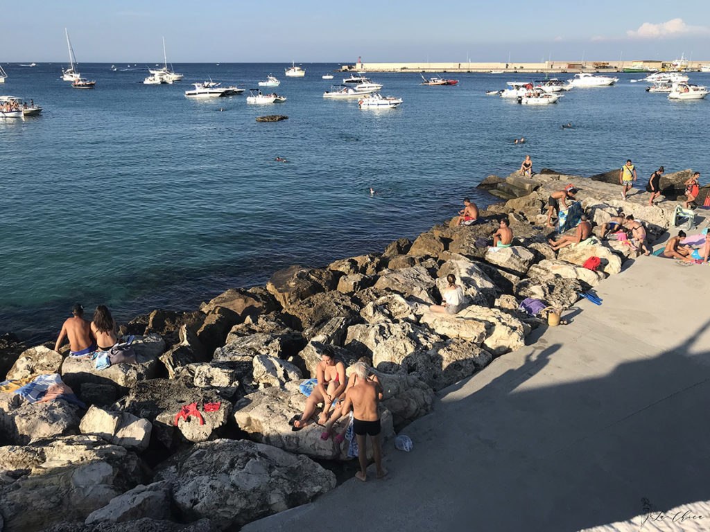 Вроде в городе есть и песчаные пляжи. Но народ купается и загорает прямо с камней у марины
