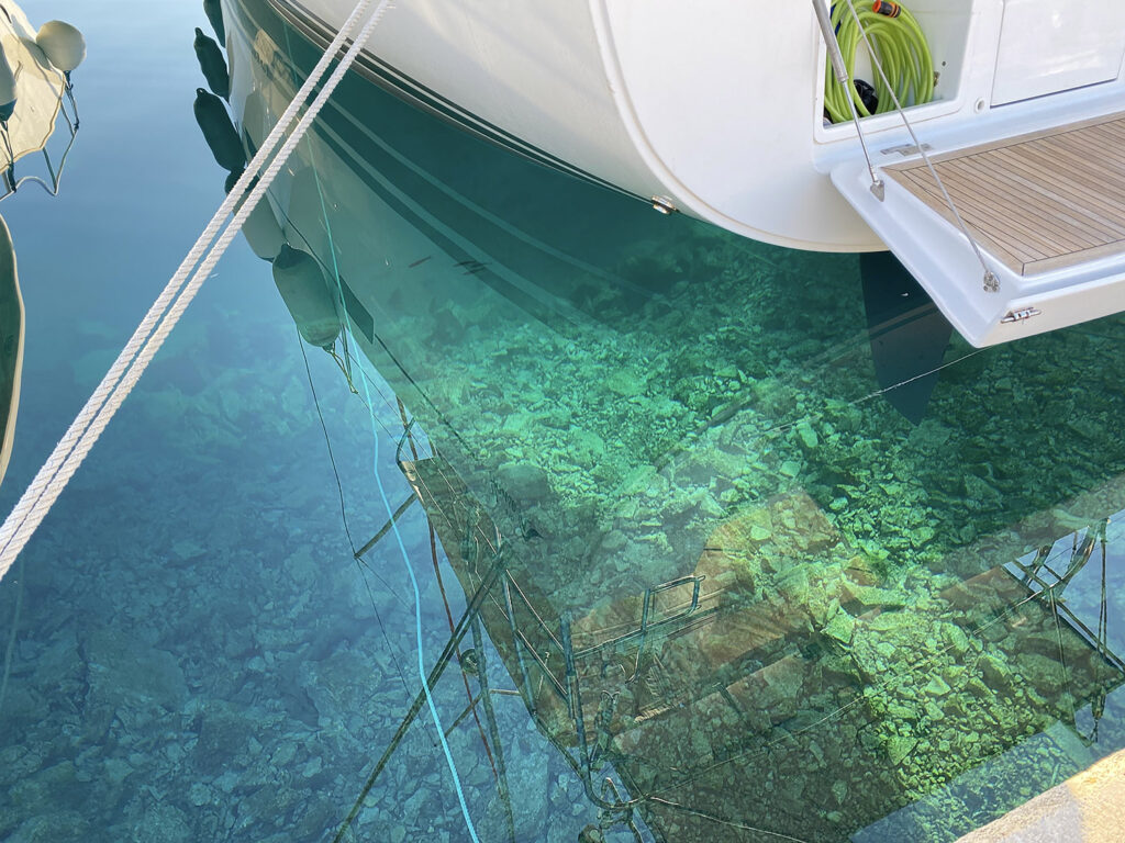 Поскольку переход из национального парка Млет в Корчулу был не длинным, то по дороге решили зайти еще в одну безымянную бухточку покупаться и запустить дрона. И нельзя сказать, что первое или второе увенчалось особым успехом 🙂 Дрон при попытке запуска в стремительном пике ушел в воду, хорошо что он у нас водоплавающий 🙂 За более чем 2 года не использования он стал остро нуждаться в калибровке горизонта. А сделать это на постоянно качающейся лодке затруднительно. Поэтому был отложен до прихода в марину. А вот с покупаться почти удалось. Плыть за дроном все же пришлось. Но несмотря на всю чистоту и красоту воды и жаркую погоду, сама вода оказалась более чем бодряща. Добровольно я бы в нее еще раз не полезла 🙂 Тут микро зарисовка попытки запуска дрона
