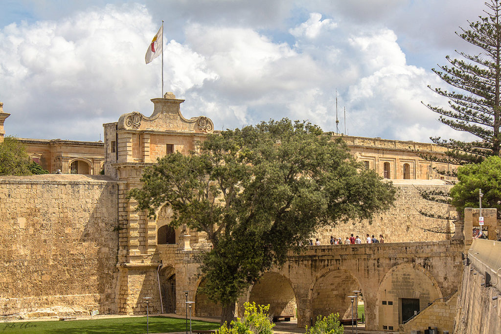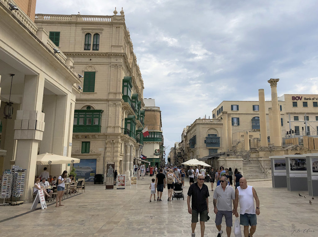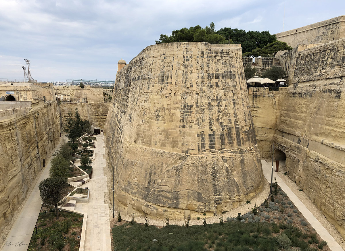 На следующий день пошли гулять в старую Валлетту. От марины до городских ворот около 1,5 км, но дорога в гору и местами совсем нет тротуара. Идти по проезжей части между высоких стен где-нибудь на изгибе дороги не очень комфортно. В самом старом центре движение ограничено, хотя и не полностью запрещено. Много пешеходных улочек, на многих из них прямо посредине стоят столики кафе и ресторанов. Есть даже ресторан прямо в толще крепостной стены. Валлетта была основана в 1566 году и ее сразу стали строить продуманно. Так, были созданы специальные системы для отвода сточных вод и удаления мусора из города, улицы были спланированы так, что морской бриз очищал и охлаждал воздух Валлетты. Последующую застройку города жилыми зданиями контролировал существующий по сей день специальный департамент городского планирования. Согласно правилам, разрешалось возводить дома только вдоль улиц, украшать их углы статуями, а во дворе устраивать колодец для сбора дождевой воды, перед фасадами запрещалось разбивать сады. По окончании строительства Валлетту обнесли рвом длиной 1 км, шириной 20 м и глубиной 18 м.
