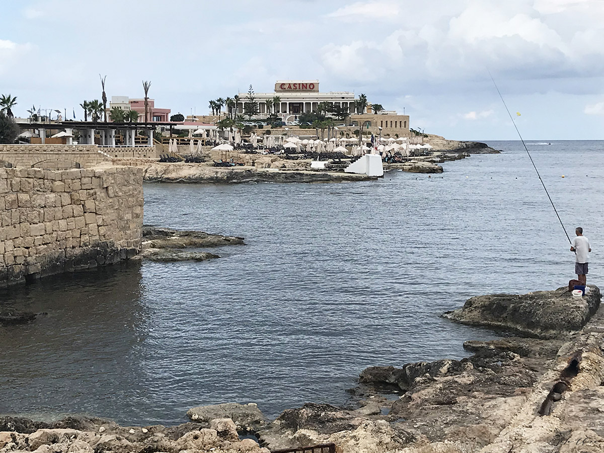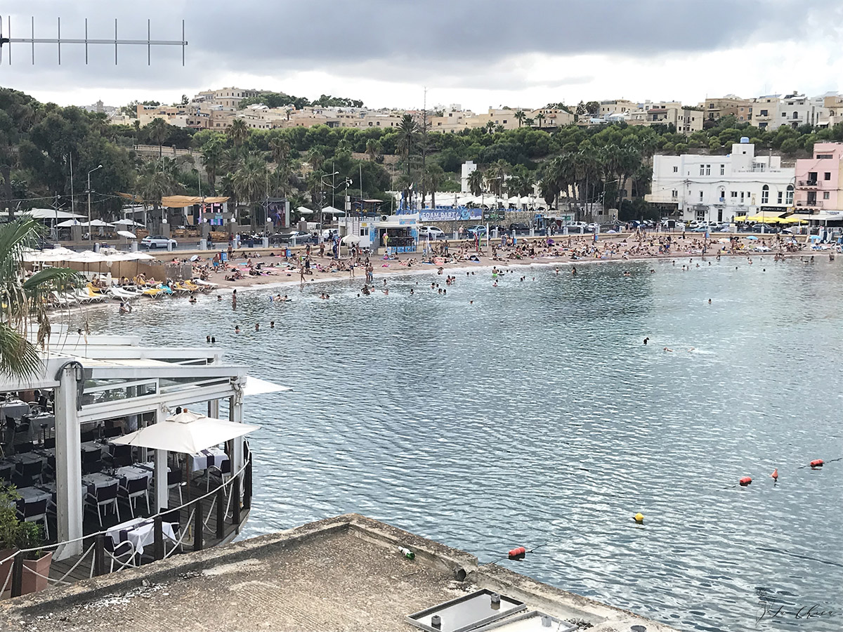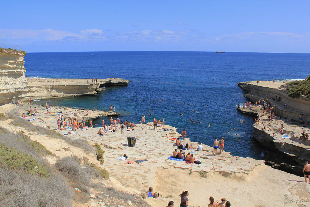 Это тоже рядом с Валлеттой, но уже не в центре. Лежаки стоят прямо на скале, вход в воду по лесенкам как в бассейне