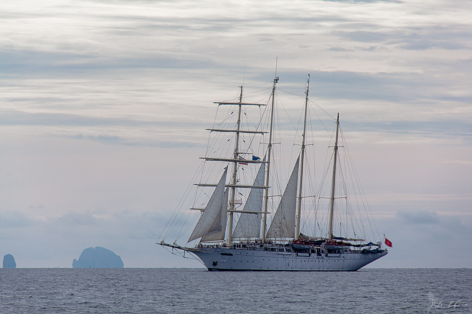По дороге к Ко Липе встретили красавицу баркентину Star Clipper. Она была спущена на воду в апреле 1992 года и предназначена для пассажирских круизов. В длину лодка 111 метров, в ширину 15. Может взять на борт до 170 пассажиров. Когда-то стартовала в Средиземном море, а сейчас добралась до наших краев. И вполне себе пользуется не только двигателем, но и парусами.