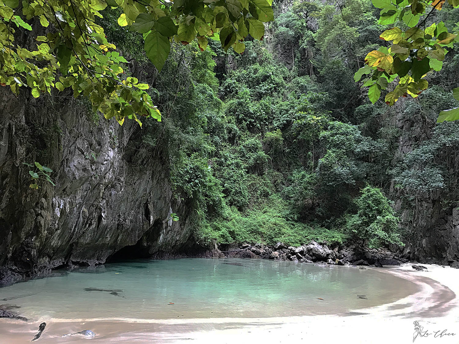 На следующий день в планах одно из основных мест этого выхода – остров Ко Мук. Здесь природа сотворила одно из своих маленьких чудес: маленький пляжик, с таким же маленьким кусочком джунглей, спрятанным полностью внутри острова. Получается как бы стакан, на дне которого плещется море у пляжика, а вход туда только через пещеру в «стенке» этого стакана. Причем что вход, что выход не особо заметны, и от одного до второго пещера не просматривается. Как и кто нашел когда-то этот проход? Для визита нужно знать точку входа и обязательно! иметь с собой фонарик, который не утонет в воде. Ход пещеры извилистый, есть ответвления, и даже примерно зная его направление вполне можно там заблудиться. Хотя в целом плыть совсем не далеко. В режиме «с мамами» от схода в воду с лодки не далеко от входа и до самого выхода внутри у нас ушло минут 10.