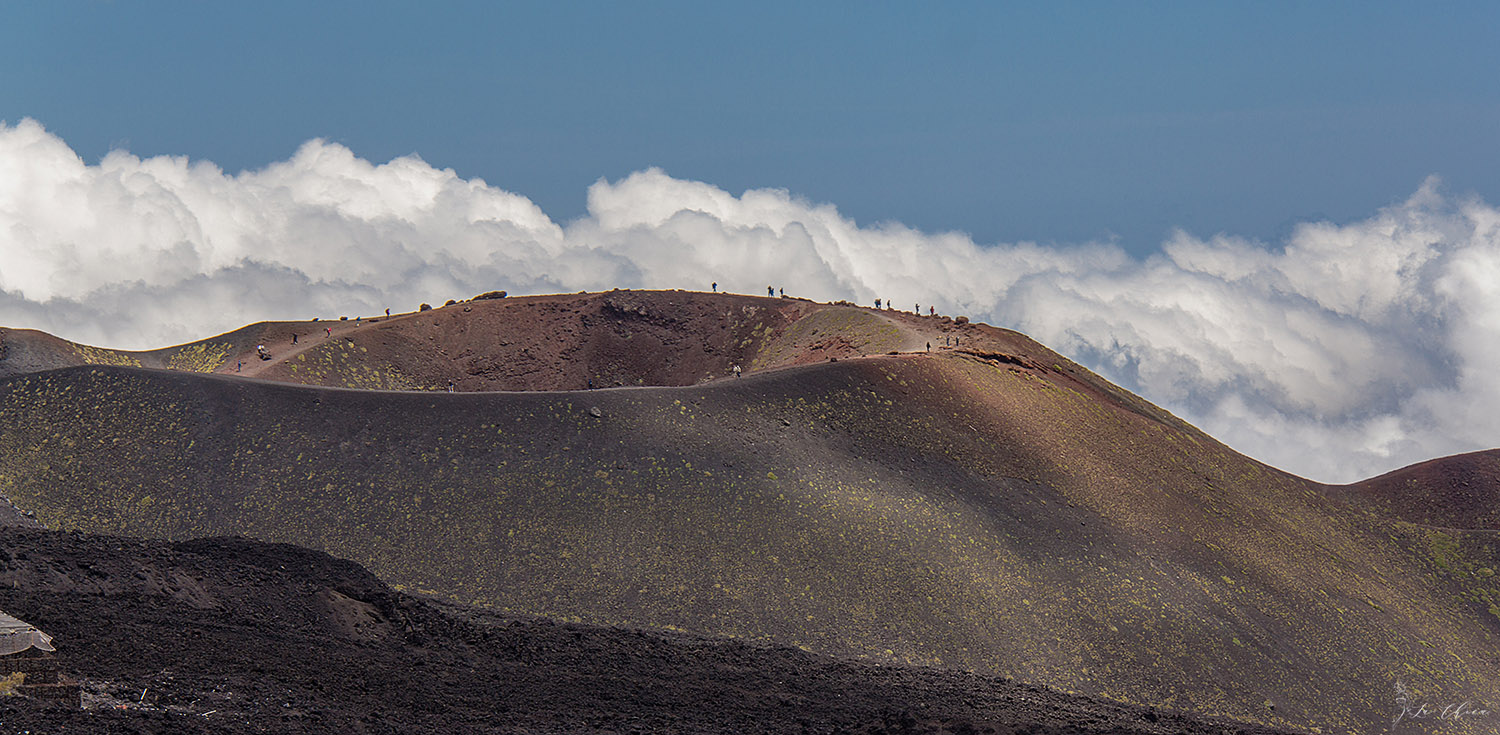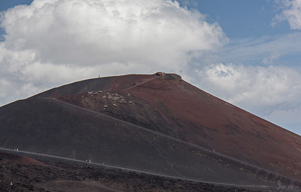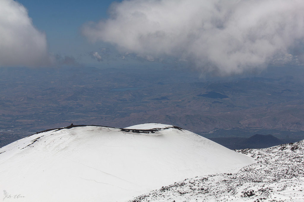 И наш первый свободный день на Сицилии посвящен конечно же красавице Этне. Попасть туда совершенно не сложно и справится в общем-то любой не очень подготовленный человек. Самое главное помнить, что общая высота порядка 3300 метров и на вершине снег, ветер и холодно, одеваться надо соответственно. С этим мы практически справились, у нашей команды не хватило только шапочки для Сережи, в остальном мы были готовы. Прямо с утра взяли машину, и буквально через 30 км от марины мы уже были на стоянке, откуда стартует фуникулер наверх. Тут пуховичек уже не лишний, но отвернувшись от ветра все же жарко, тянет расстегнуться. Издесь же, еще на подъезде, хорошо видны два крупных боковых посещаемых кратера Этны.