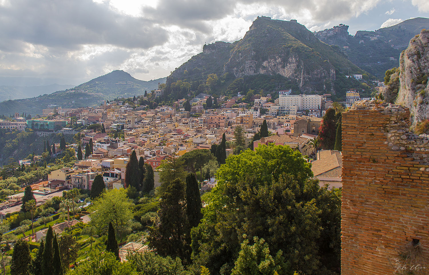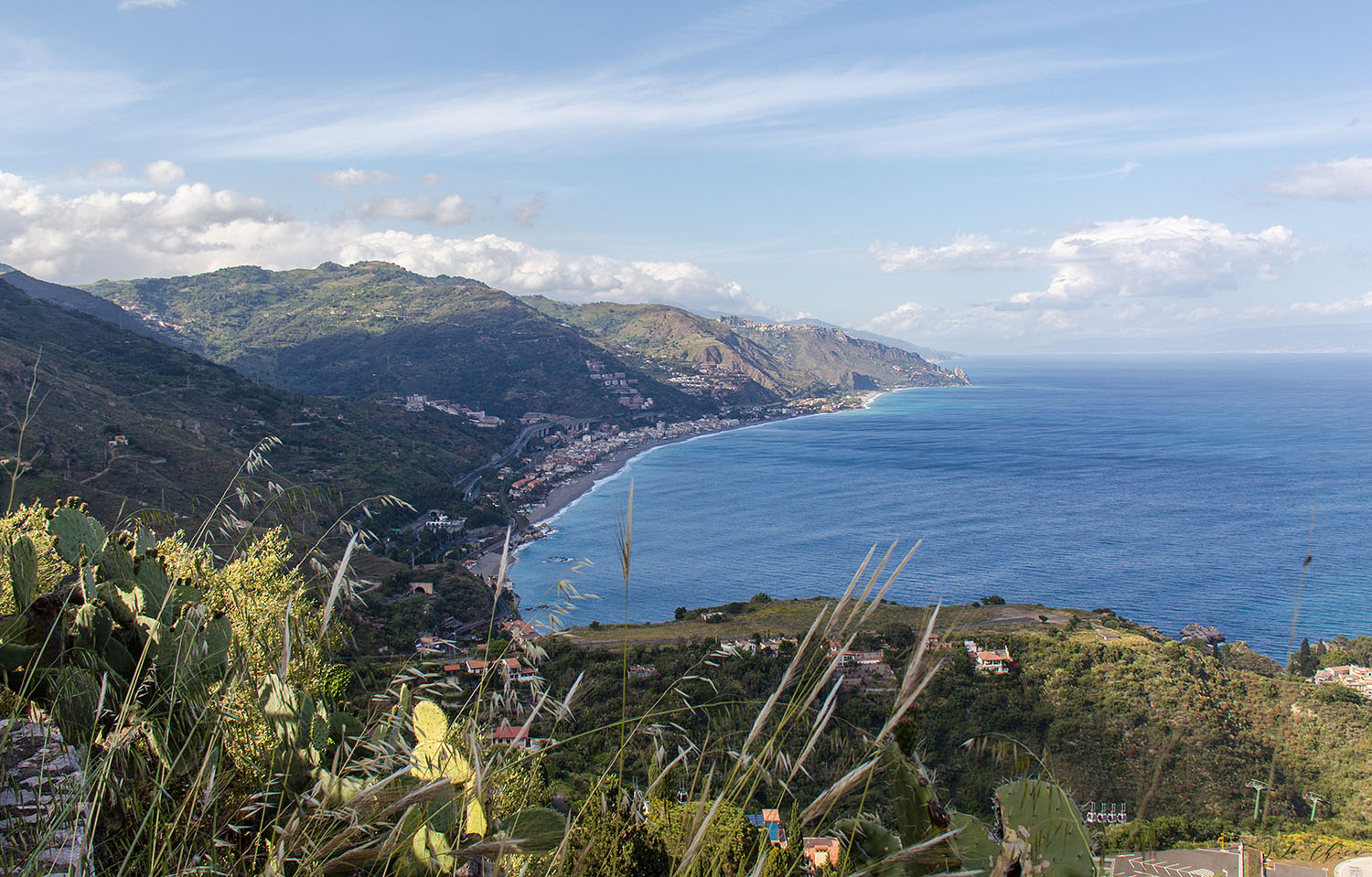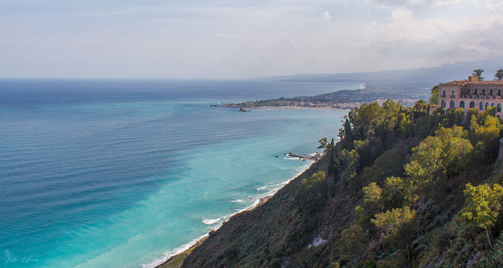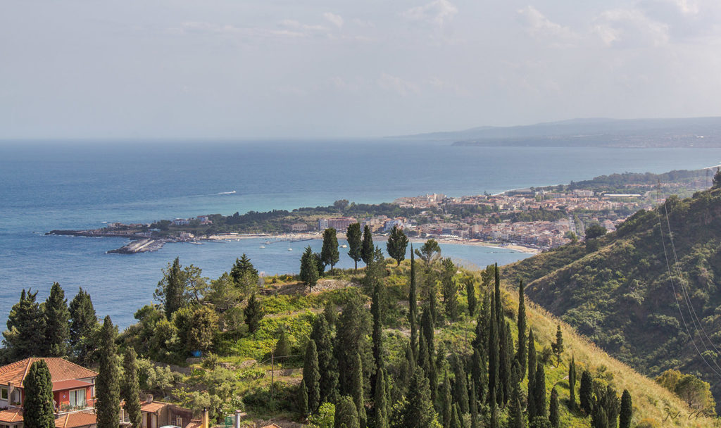 Поскольку вся поездка заняла у нас чуть больше половины дня, то на вторую половину решаем скататься погулять в Таормину. Это небольшой старинный городок, приютившийся на скале на высоте более 200 метров от моря. На сегодняшний день мега туристический, что несколько портит впечатление. По сути, это одна главная улица вдоль обрыва, по которой все и прогуливаются туда-сюда. Очень похоже на Санторини: и по духу, и частично по внешнему виду, и особенно по количеству народа. Зато открывающиеся виды объясняют стремление людей попасть сюда. Вот так заехать прогуляться и поужинать – однозначно советую. Выбрать Таормину как базу для своего отдыха на Сицилии? Сильно вряд ли.