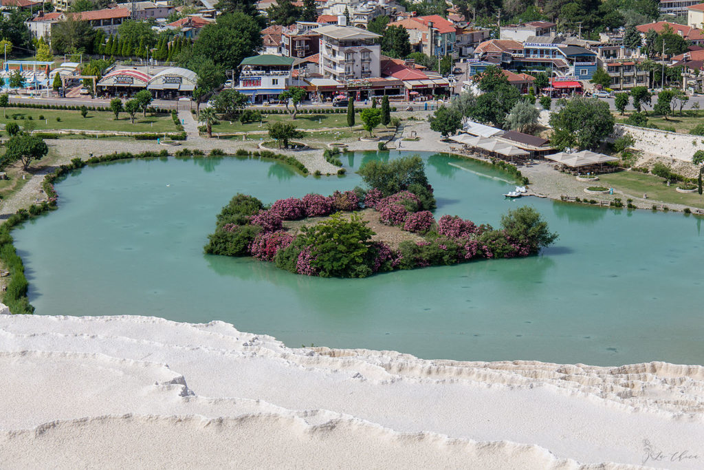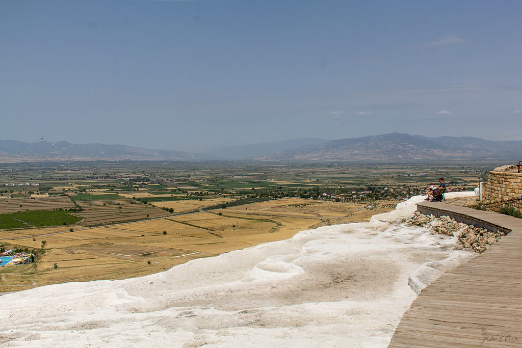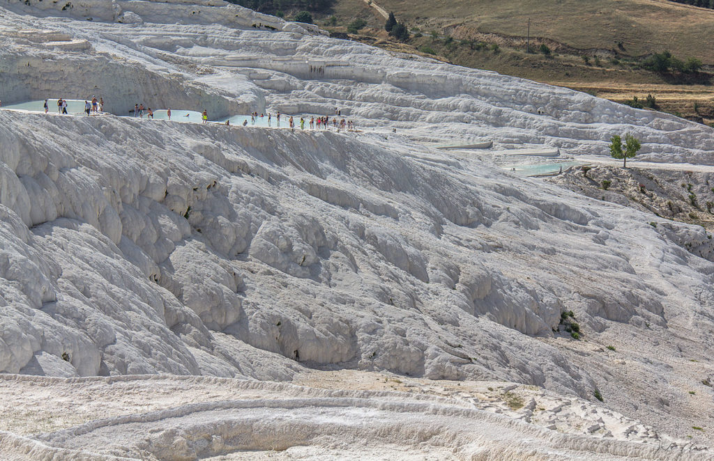 Чего я не ожидала, так это размаха всей этой красоты. В ширину по верхнему краю травертиновые террасы вроде как больше 3 км. В центре, где можно войти и побродить непосредственно по склону и воде, кишмя кишат туристы. Но если не полениться и дойти до любого края, то если и не одиночество, но уже ограниченное число соседей тебе обеспечено. И в этих условиях уже можно любоваться красотой без гвалта вокруг.