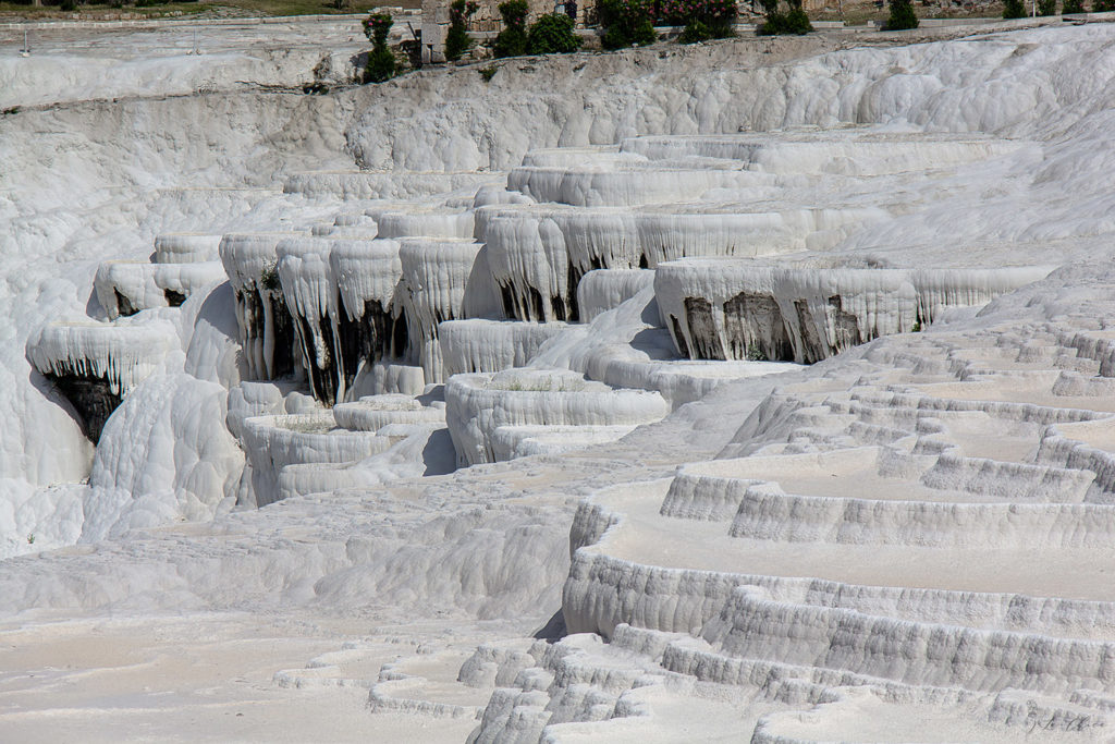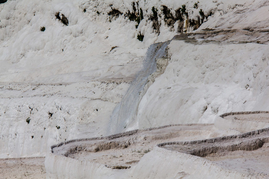 Говорят, что террасы практически затоптали несколько лет назад, и из белых они превратились в серые. И после этого ограничили места, где можно ходить непосредственно по склону. Мне сравнивать не с чем, до этих изменений я не видела что было. Но на мой взгляд и сейчас открыт достаточно большой и протяженный участок для гуляний. Что для меня оказалось неожиданным, так то что часть чаш стоят сухими. То ли за годы минеральные источники поменяли свои пути выхода, то ли это уже дело рук человека с каким-то умыслом?..
