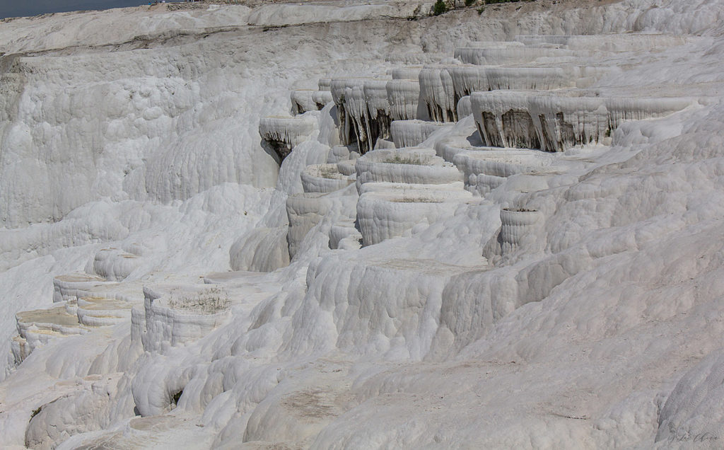 Название Памуккале переводится как хлопковый замок. В этом районе бьет множество минеральных источников разных по составу. Белоснежный вид получился из-за воды богатой карбонатом кальция. Где-то вода испарялась под жаркими лучами солнца, где-то просто оседали минералы, и в результате, за тысячи лет, весь склон горы покрылся белым травертином – известковым туфом.
