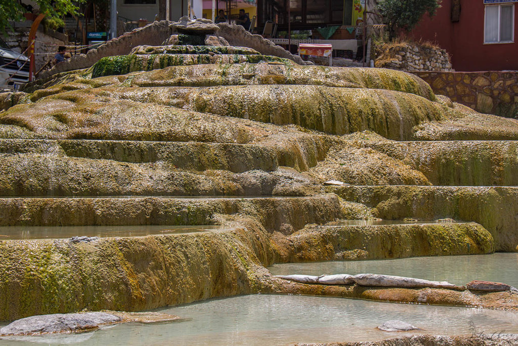 Помимо непосредственно белого Памуккале я заехала еще и в расположенные неподалеку так называемые красные источники. Рельеф примерно такой же как и у Памуккале, но минеральный состав воды другой, с преобладанием оксидов железа. Цвет отложений получается красно-буро-желтый. И температура воды сильно горячее: градусов до 50-60, и даже есть источники под 80 градусов, тогда как в Памуккале не выше 35 из того что я щупала. Ну и размах здесь совсем не тот. Почти все красные террасы можно осмотреть стоя на одном месте. Так что интересный и познавательный, но не долгий визит.