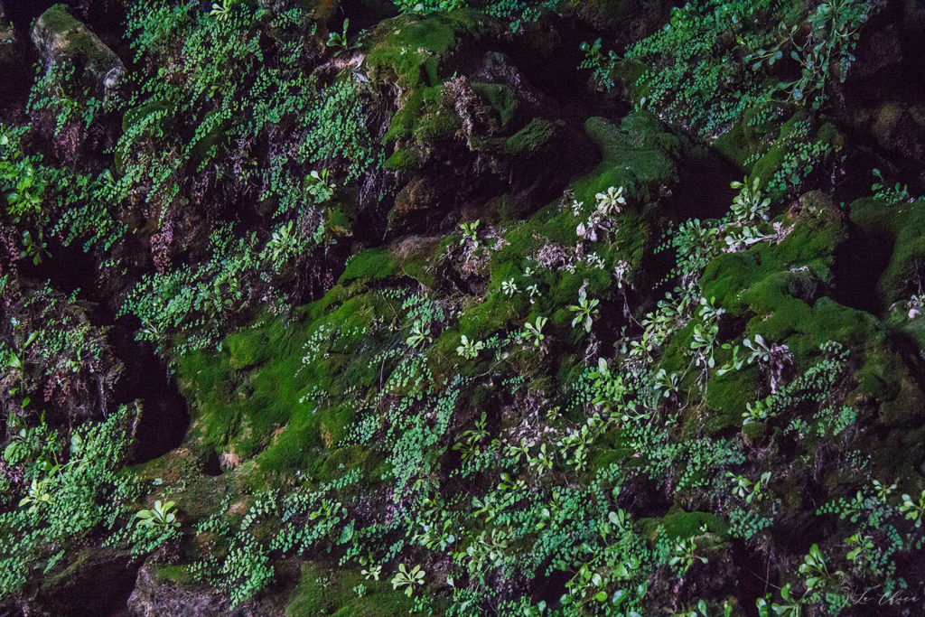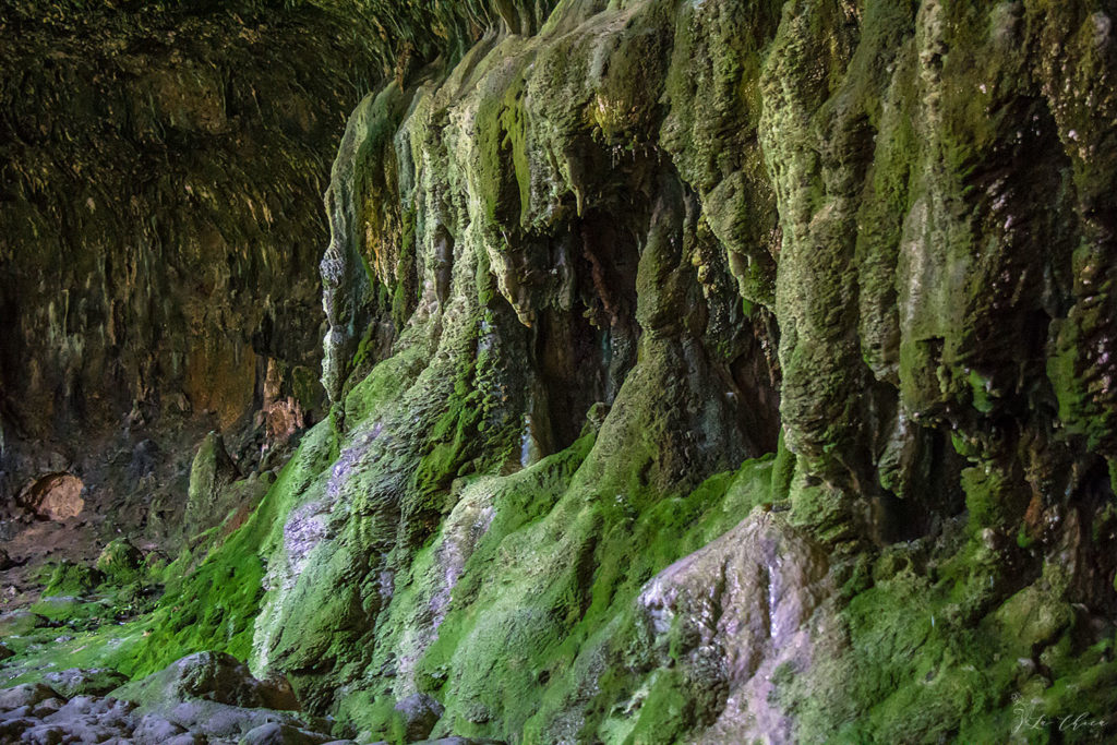 Все стены пещеры куда попадает свет густо заросли мхом