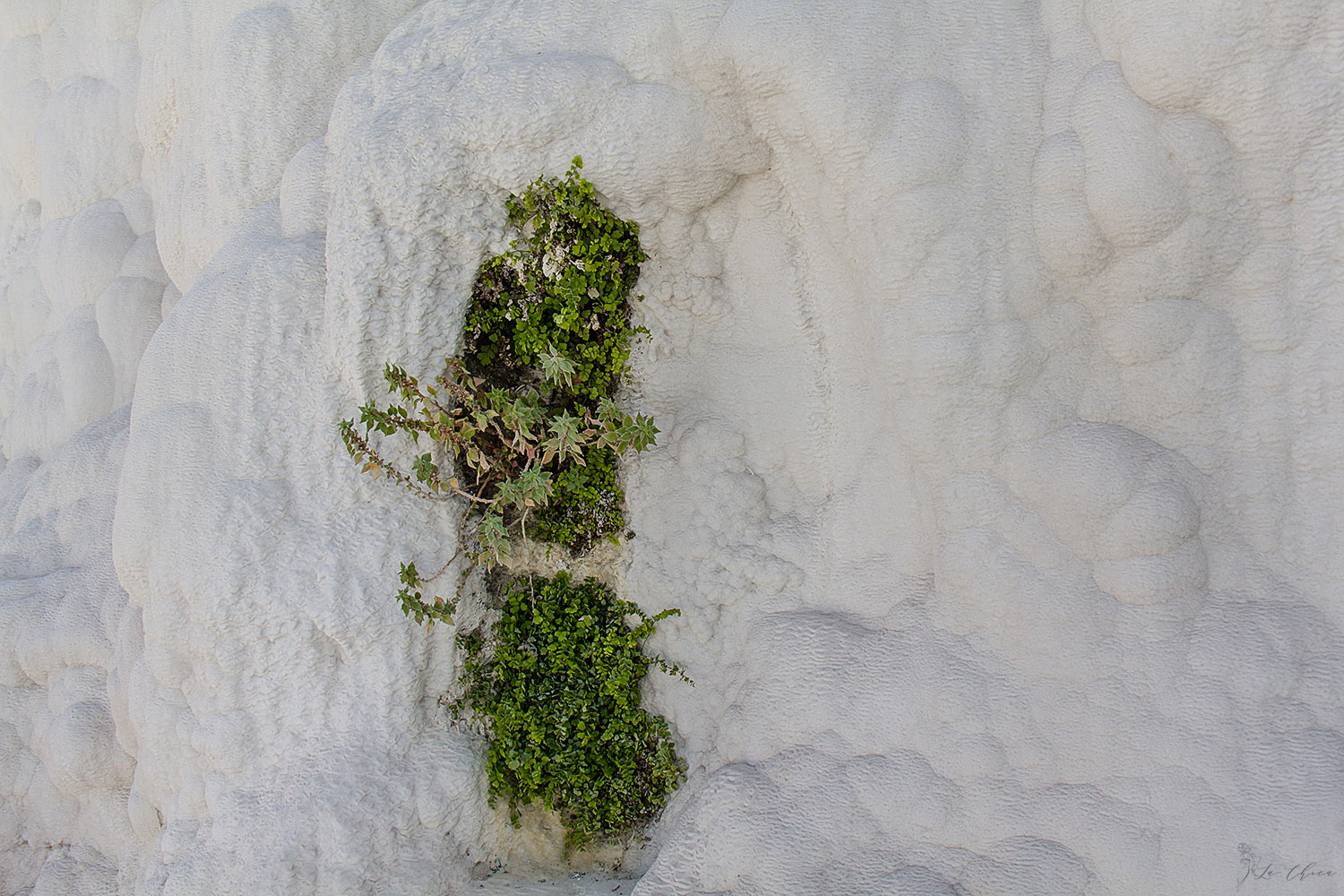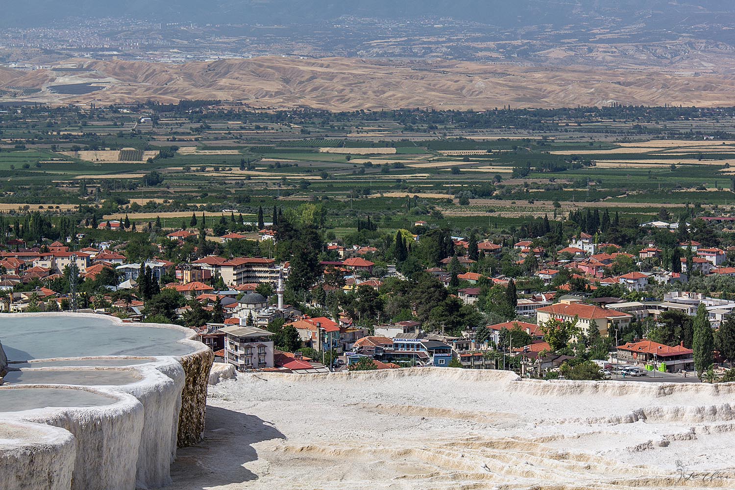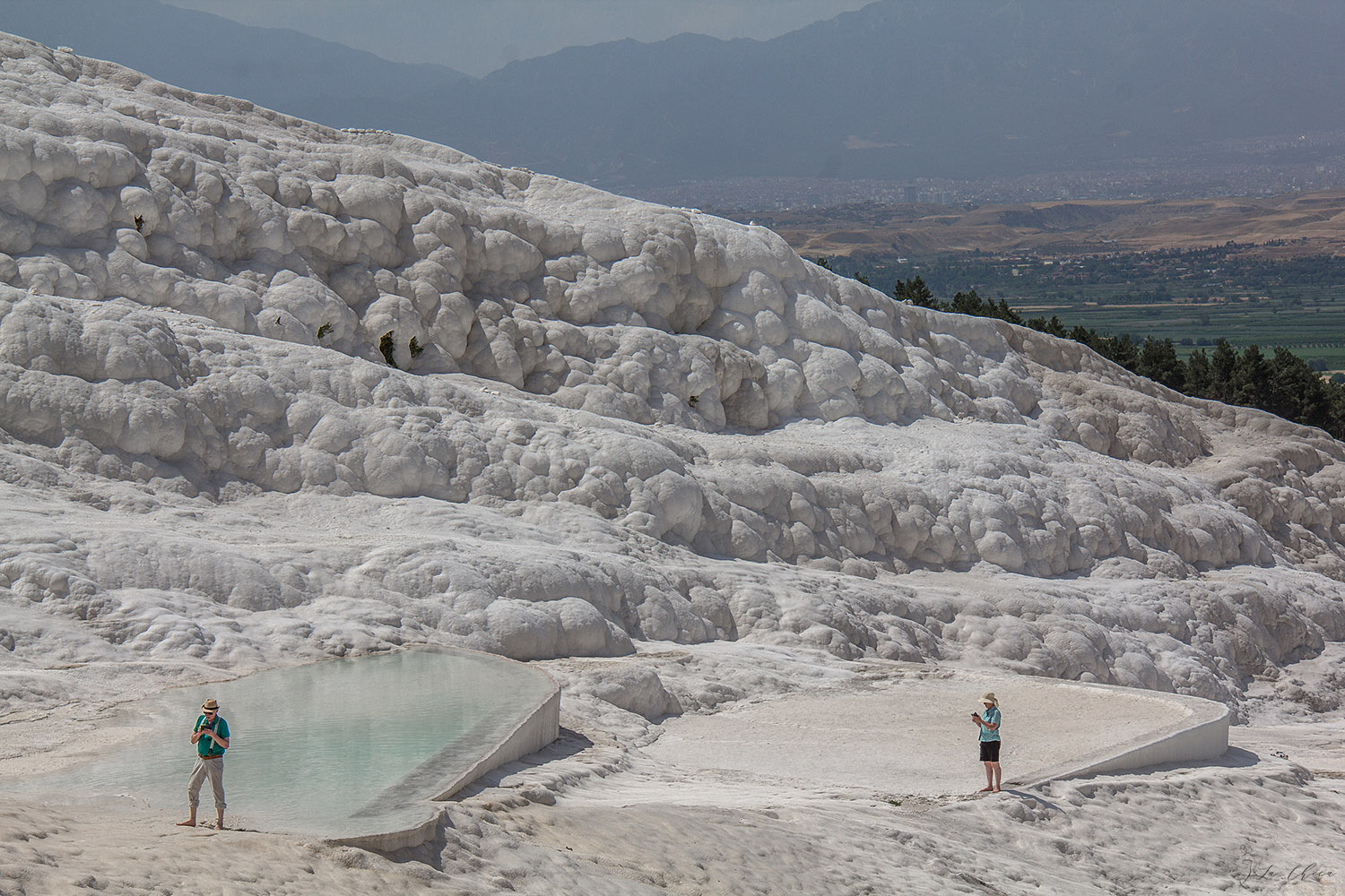 Чего я не ожидала, так это размаха всей этой красоты. В ширину по верхнему краю травертиновые террасы вроде как больше 3 км. В центре, где можно войти и побродить непосредственно по склону и воде, кишмя кишат туристы. Но если не полениться и дойти до любого края, то если и не одиночество, но уже ограниченное число соседей тебе обеспечено. И в этих условиях уже можно любоваться красотой без гвалта вокруг.