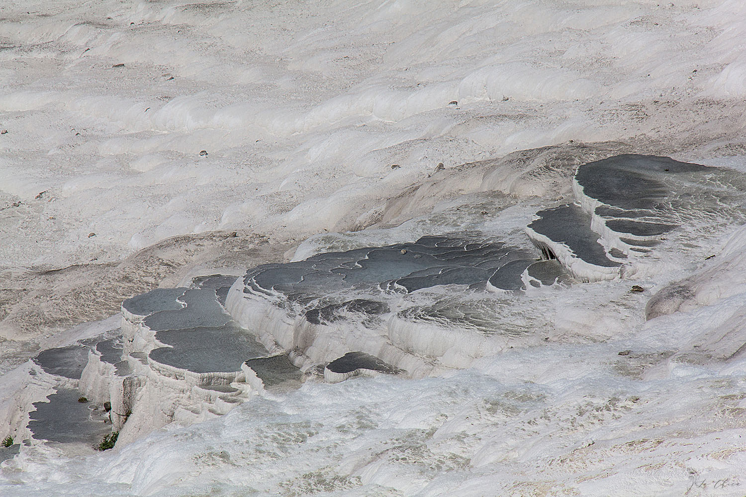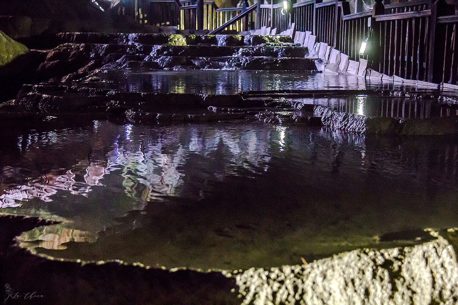 Говорят, что террасы практически затоптали несколько лет назад, и из белых они превратились в серые. И после этого ограничили места, где можно ходить непосредственно по склону. Мне сравнивать не с чем, до этих изменений я не видела что было. Но на мой взгляд и сейчас открыт достаточно большой и протяженный участок для гуляний. Что для меня оказалось неожиданным, так то что часть чаш стоят сухими. То ли за годы минеральные источники поменяли свои пути выхода, то ли это уже дело рук человека с каким-то умыслом?..