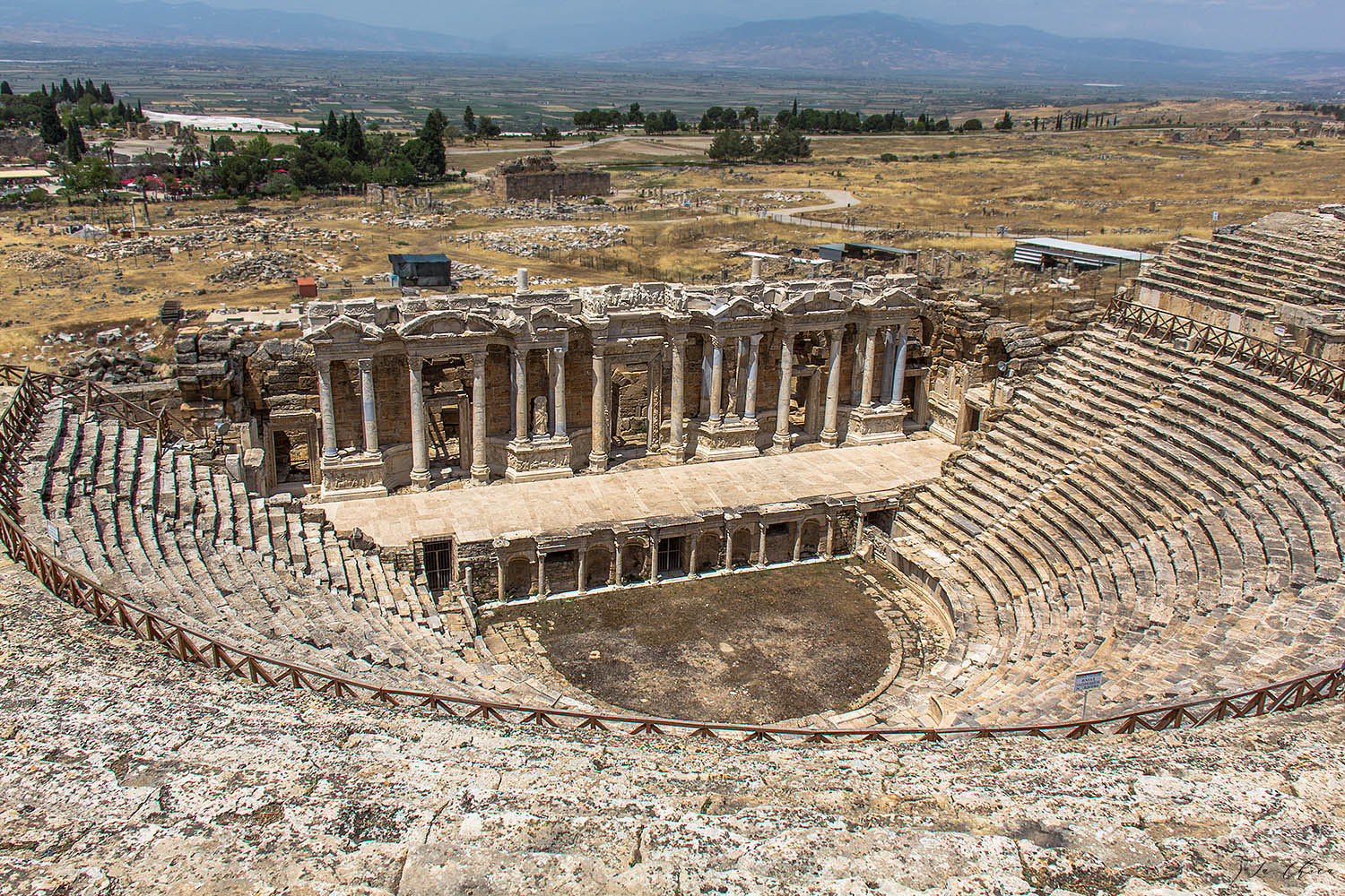 Целебные свойства местной воды были известны с древности. Еще во 2 веке до н.э. прямо рядом с террасами был построен древнеримский бальнеологический город-курорт Иераполис. Но место для строительства было все-таки не самым удачным. В этом месте достаточно часты землетрясения. Несколько раз город разрушался и восстанавливался. И вроде где-то в 6-7 веке нашей эры окончательно был разрушен персами. Археологические раскопки начались здесь в конце 19 века, и продолжаются до сих пор. Самым значимым и восстановленным объектом является театр. По разным данным в нем могло поместиться от 12 до 20 тысяч зрителей. Размер действительно впечатляющий.