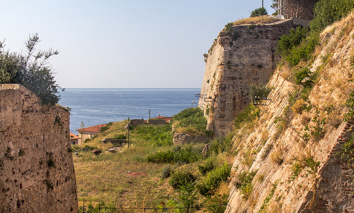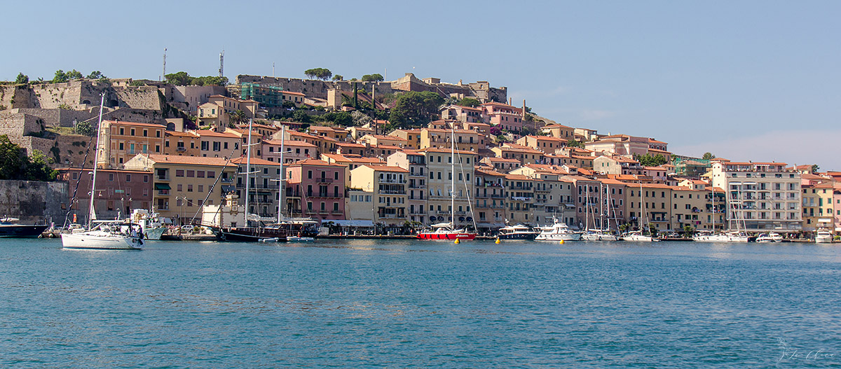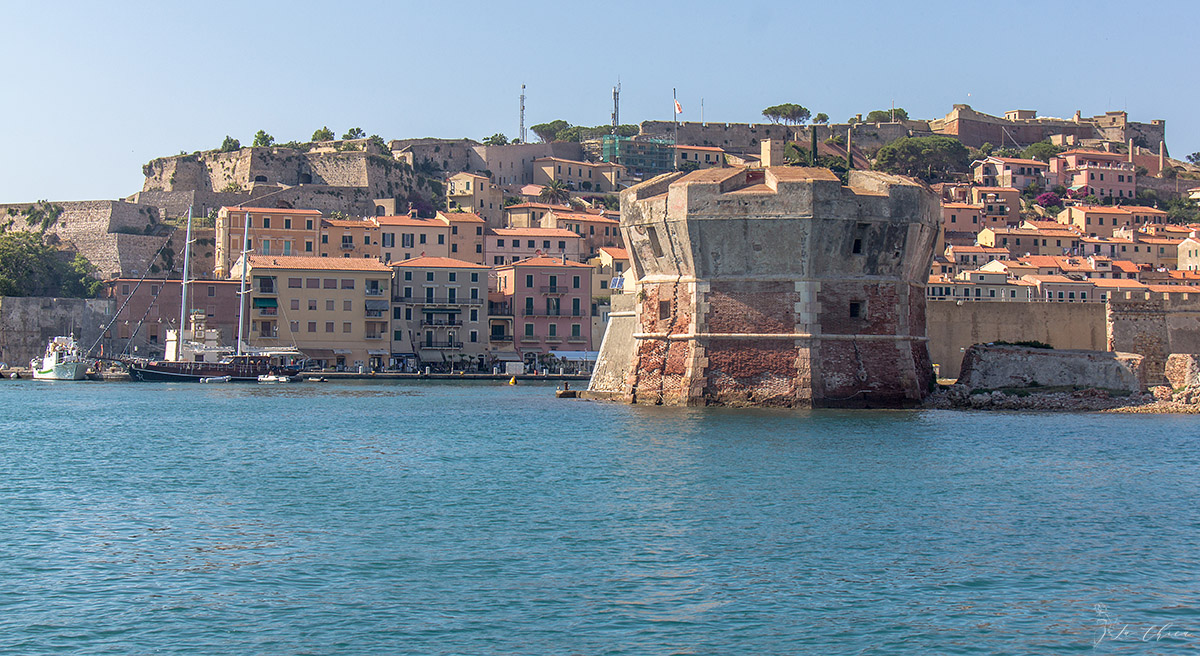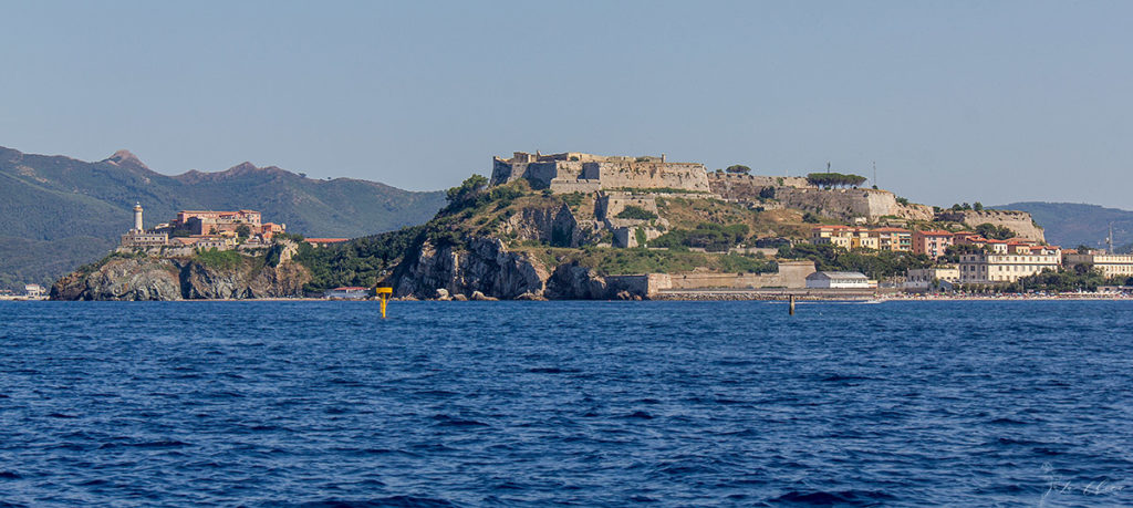 За ту неполную неделю, что нас не было, погода совершенно успокоилась. Настолько, что ветра не было совсем и всю дорогу до Эльбы мы моторили по зеркалу моря. Еще на подходе сразу видно защитную крепость на вершине холма вокруг бухты Портоферайо – столицы Эльбы. “Порт железа”, как переводиться название с итальянского, был основан еще в середине XVI века. И исторический центр хорошо сохранился до сих пор.