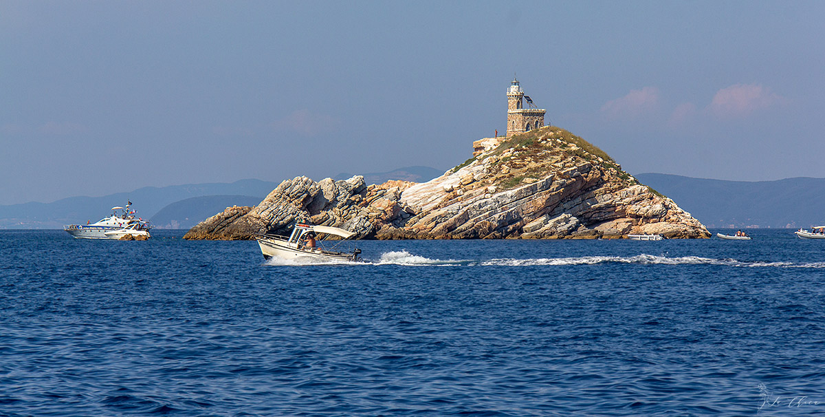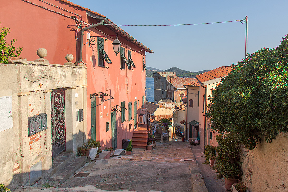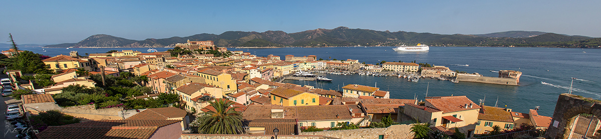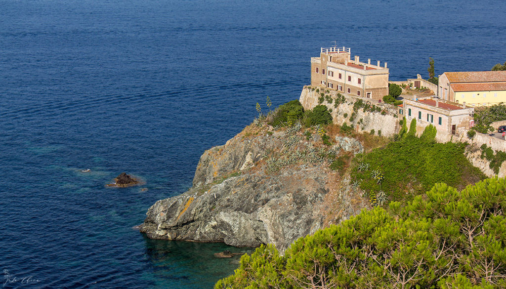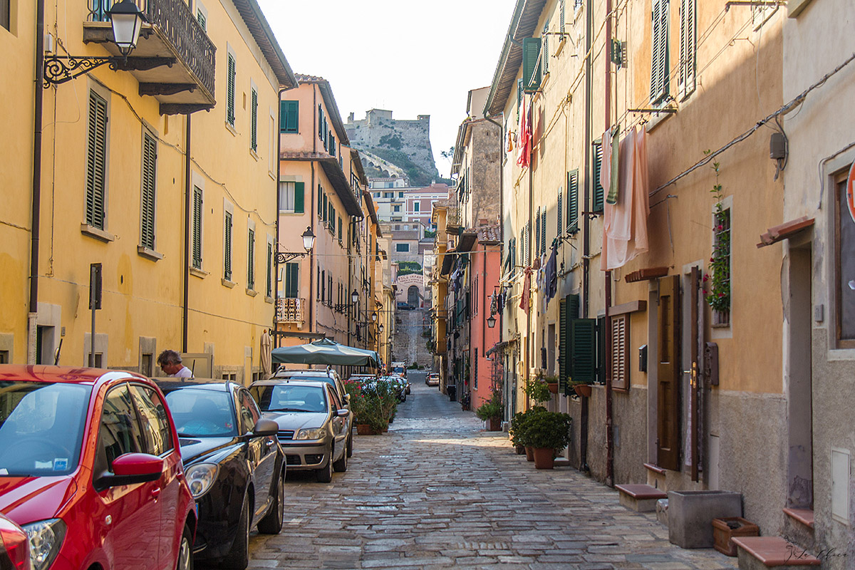 За ту неполную неделю, что нас не было, погода совершенно успокоилась. Настолько, что ветра не было совсем и всю дорогу до Эльбы мы моторили по зеркалу моря. Еще на подходе сразу видно защитную крепость на вершине холма вокруг бухты Портоферайо – столицы Эльбы. “Порт железа”, как переводиться название с итальянского, был основан еще в середине XVI века. И исторический центр хорошо сохранился до сих пор.