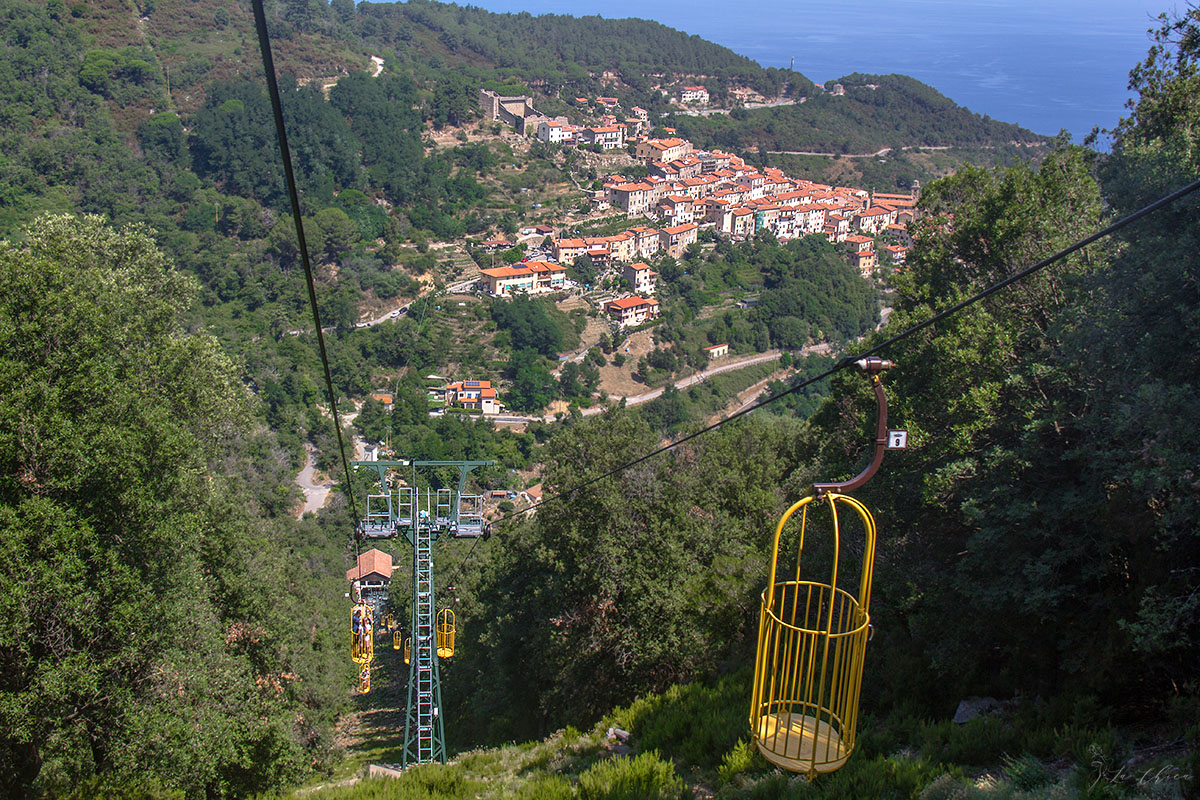 После более чем напряженного графика последних двух недель уже не хотелось ничего, ни достопримечательностей, ни исследования нового города. Поэтому первый вечер провели ничего не делая на лодке, и даже на ужин пошли в ближайшую к нам кафешку. Которая, как потом случайно оказалось, одна из топовых в Портоферайо 🙂 Сережа всегда умеет выбирать места для ужина, даже когда делает это наобум))) Следующий день тоже был назначен ленивым. Поэтому отсыпались, прибирались, осваивали местные прачечные. А вот уже на второй день решили и остров посмотреть, не зря же мы сюда пришли. Для начала решили взять машину и прокатиться до фуникулера и посмотреть на остров с высоты. И лишь чудом в одной из прокатных контор нашли свободную машину, настолько спрос превышает предложение в сезон. И доставшееся нам чудо техники было годов 90х выпуска, хорошо хоть ехало и даже кондиционер работал. Я очень люблю забраться на смотровые куда повыше и никогда не пропускаю никакие канатки, если они попадаются у нас на пути. Но с такой конструкцией как на Эльбе столкнулась впервые: маленькие стоячие кабинки на двух человек. А наверху… Эльбу видно во все стороны. Не так жарко как на побережье, народу не то чтобы совсем нет, но его количество еще не напрягает. И совершенно нереально пахнет какими-то травами-цветами. Но моих познаний не хватает для определения чем же именно.