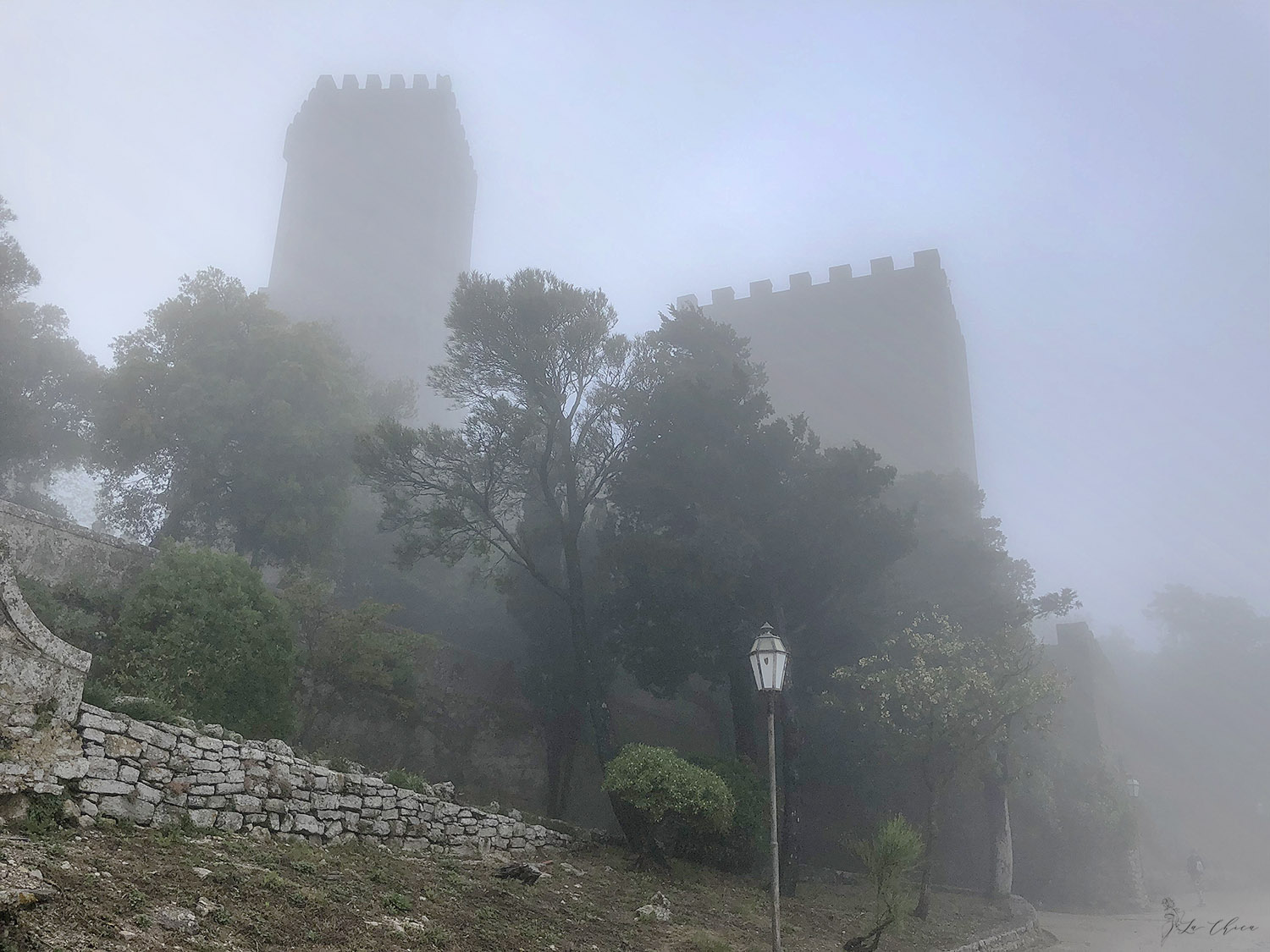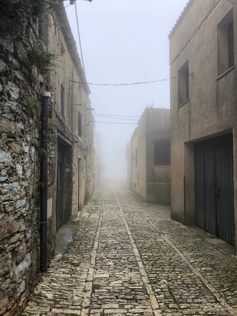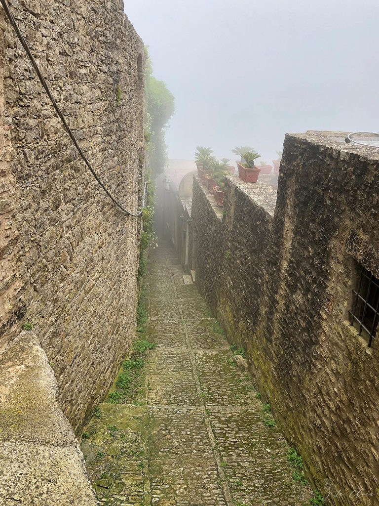 В один из дней, взяв в аренду машину, мы поехали кататься по окрестностям Палермо. Нашей целью была небольшая средневековая деревушка на вершине небольшой горы. И чтобы мы полностью смогли погрузиться в атмосферу средневековья с самого начала пути, погода, судьба и навигатор, видимо сговорившись, вывели нас на старую дорогу на верх. Когда ее еще только прокладывали движение я так полагаю было только верховым. Поэтому ширина дороги, крутизна поворотов и серпантин были явно рассчитаны на ширину коня, а никак не на современной машины. И завершающим штрихом стало плотное облако, осевшее на вершине вокруг Эриче и подступов к нему. Видимость была от силы метров 30 наверное. Едешь в никуда, виден только обрыв рядом и так и ждешь появления рыцаря в латах, ну или хотя бы крестьянина с косой.